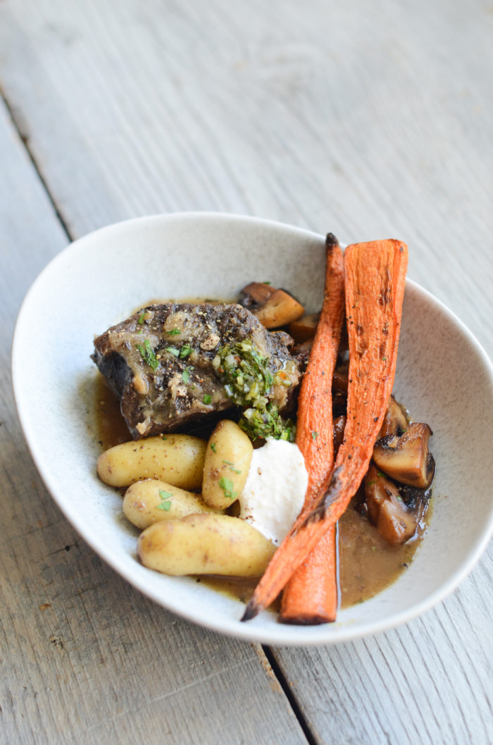 Note: This beef stew is really a cross between a pot roast dinner and a beef stew, to maximize flavor and make a special presentation. The recipe has several steps, none of which are difficult, so don’t let it intimidate you. It’s a perfect Sunday afternoon, dance around the kitchen recipe. Serve the stew in wide, shallow bowls so that you can see each beautiful part. You don’t need both gremolata and horseradish cream for garnishes – each one is delicious with the stew on its own – but the two together are pretty special. Just like Zoë!