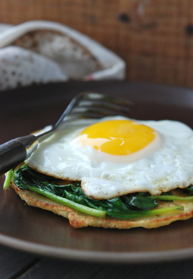 Before you fry the eggs, plate the pancakes and top with spinach. Fry eggs in olive oil to desired doneness, nestling an egg on top of spinach and pancakes as you go. Top with a sprinkle of salt & a grind of black pepper and serve immediately.